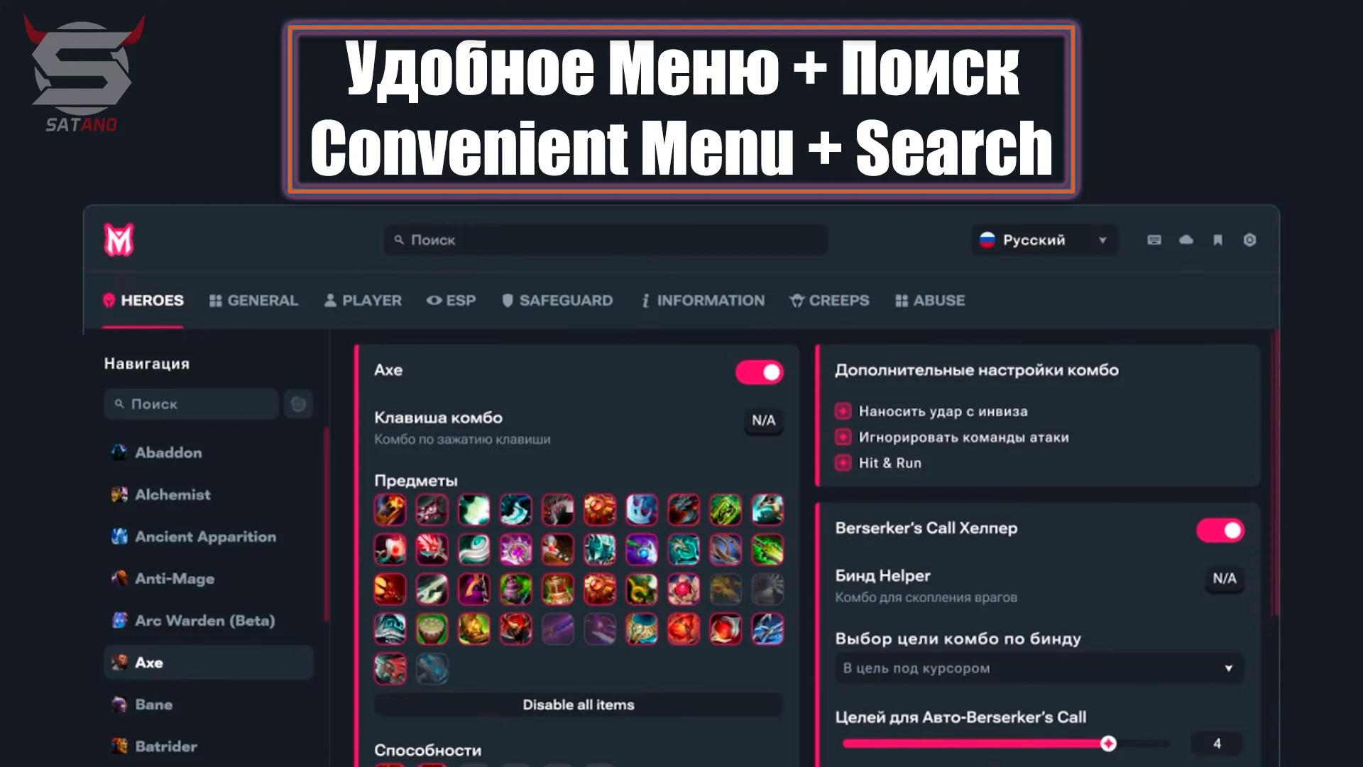 - Items - выбор предметов, которые будут использоваться в комбо